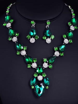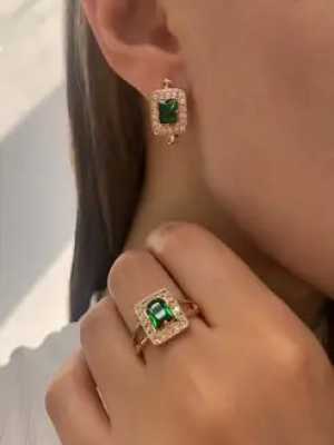 Комплект украшений с зелеными камнями выполнен из качественного металлического материала.