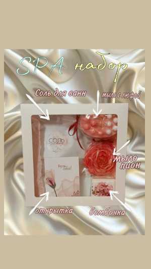 В набор входит: ♡Соль для ванны( Английская, магниевая)- 350гр ♡Массажное мыло с люфой ♡Мыло в форме пиона ♡Ароматная...