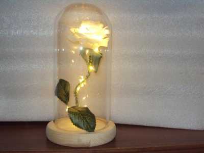 Цвет: белый, розовый. Роза со светодиодной подсветкой в прозрачной колбе на деревянной подставке, размер: 9x11x21 см.